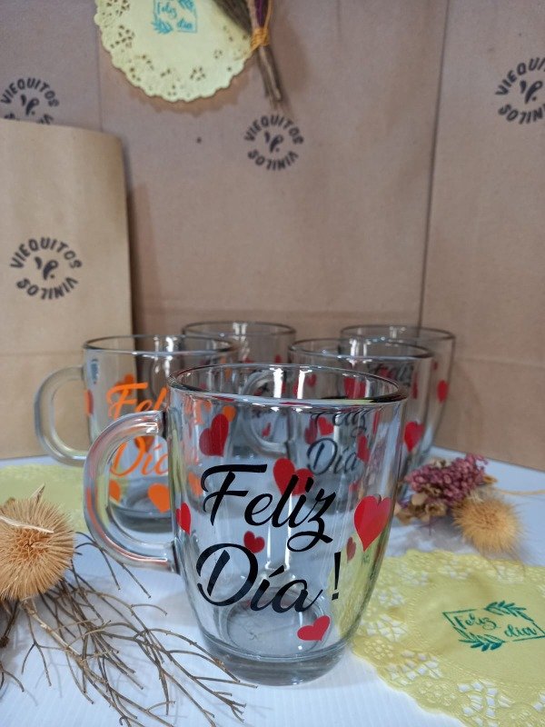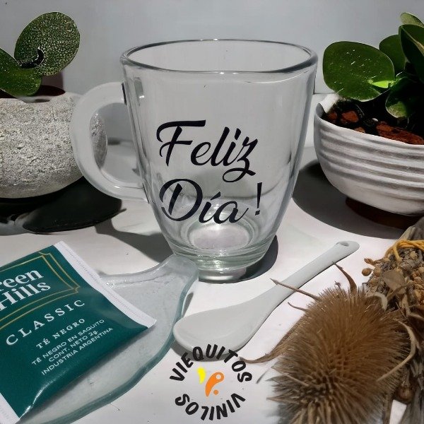 Taza Rigolleau con diseño en vinilo. Capacidad 370 ml. Cucharita de cerámica, posa saquitos hoja de vidrio.